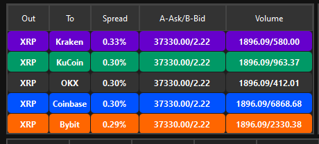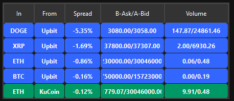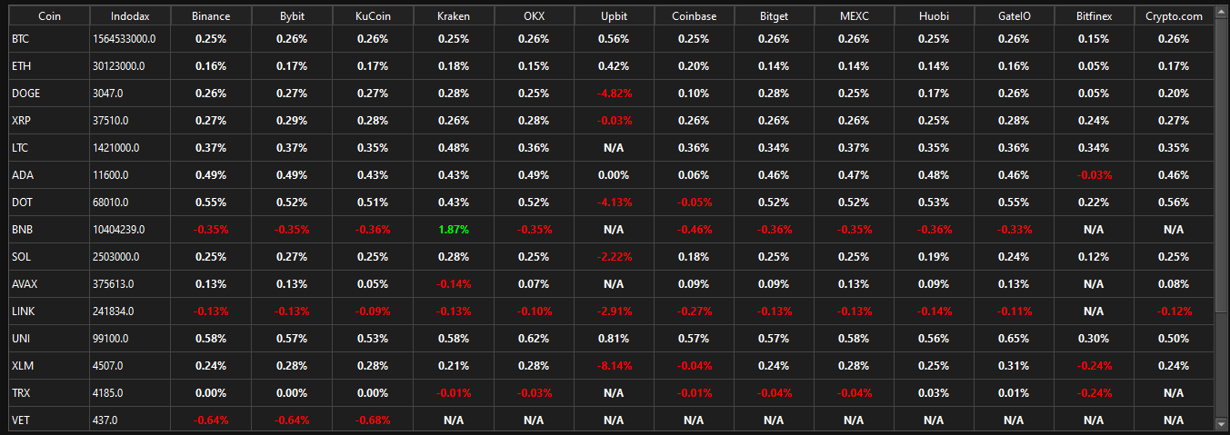 Tabel utama menampilkan coin dan data spread realtime dari Indodax terhadap 13 market lain dan mengkalkulasinya secara otomatis, sehingga Anda hanya perlu mengamatinya.